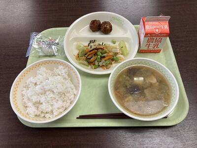 メニューは、麦ごはん、肉団子、キャベツと枝豆のおひたし、芋汁、お月見団子です。