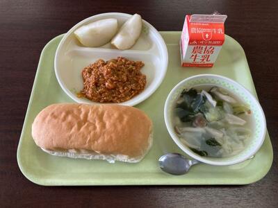メニューは、コッペパン、スラッピージョー、野菜スープ、日本ナシです。