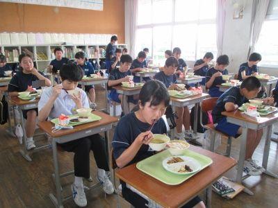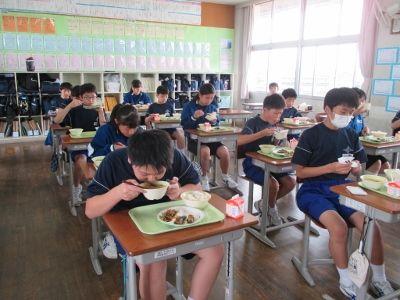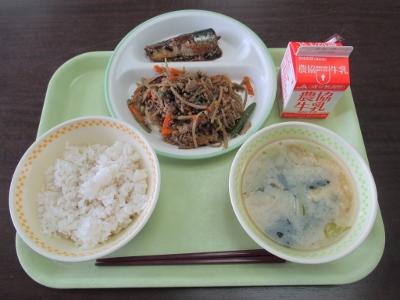 メニューは、麦ごはん、牛乳、いわしの梅煮、きんぴらゴボウ、小松菜と油揚げのみそ汁です。