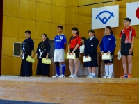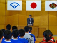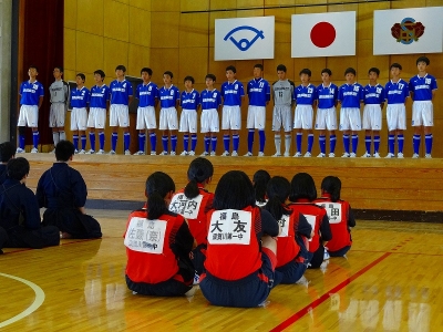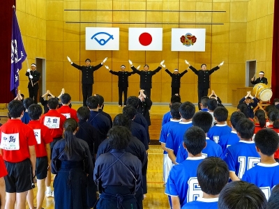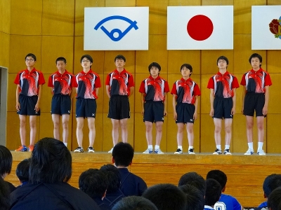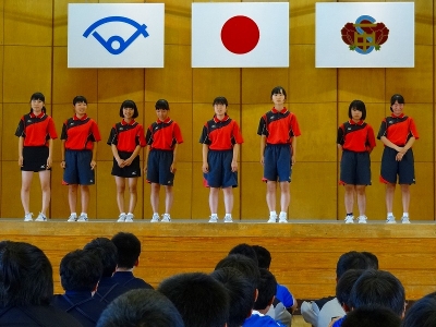 6月12日(月)6校時、全校集会があり、各種表彰を行った後、中体連県中地区総合大会及び水泳大会に向けた壮行会を行いました。ソフトテニス部女子団体、サッカー部、剣道部男女団体・男子個人2名、卓球部男子団体・個人シングルス2名・個人ダブルス1ペア及び特設水泳部個人3名が大会に臨む意気込みを堂々と発表しました。その後、全校生による応援壮行を行いましたが、前回の壮行会以上の力強さがあり、選手たちの士気も一段と高まりました。