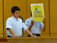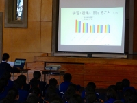 全校集会の終わりには、毎回生徒会専門部が順番に活動発表や呼びかけを行っています。今回は報道部・学習部・図書部・生徒会執行部が、学級新聞を含めた掲示物に目を通すことの必要性や期末テストに向けた計画的な家庭学習の大切さ及び推薦図書などを全校生に伝えました。
