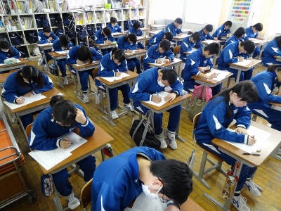 本日、3年生は第5回実力テストに挑みました。一昨日期末テストを終えたばかりですが、体力も気力も十分な状態でテストに取り組むことができました。三者相談を終えて、3年生は進路目標をはっきりさせ、しっかりした気持ちで生活しています。