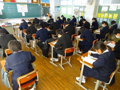 本日1月25日(水)から明日まで3年生は期末テストです。テスト1日目、子どもたちは中学校最後の定期テストに集中して取り組みました。明日のテストも頑張りましょう。
