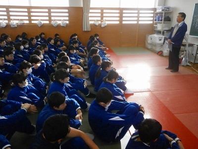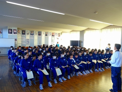 2017年12月19日 15時41分12月19日(火)6校時、2・3学年は学年集会を行いました。1学年は昨日12月18日(月)6校時、学年集会を行いました。どの学年でも生徒たちは落ち着いて集会に参加しており、各学級代表の2学期の反省を聞いたり、冬休みの過ごし方について確認したりして、冬休みを迎える準備をしました。