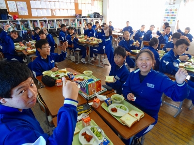 本日12月20日(水)の給食は、一足早いクリスマス献立でした。メニューは、食パン・牛乳・プチケーキ(チョコ)・タンドリーチキン・もみの木サラダ・コンソメスープ・イチゴ&マーガリンでした。どれも生徒たちの大好物で、いつにもまして笑顔で美味しそうに食べていました。
