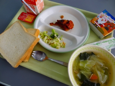 2017年12月20日 13時09分 本日12月20日(水)の給食は、一足早いクリスマス献立でした。メニューは、食パン・牛乳・プチケーキ(チョコ)・タンドリーチキン・もみの木サラダ・コンソメスープ・イチゴ&マーガリンでした。どれも生徒たちの大好物で、いつにもまして笑顔で美味しそうに食べていました。
