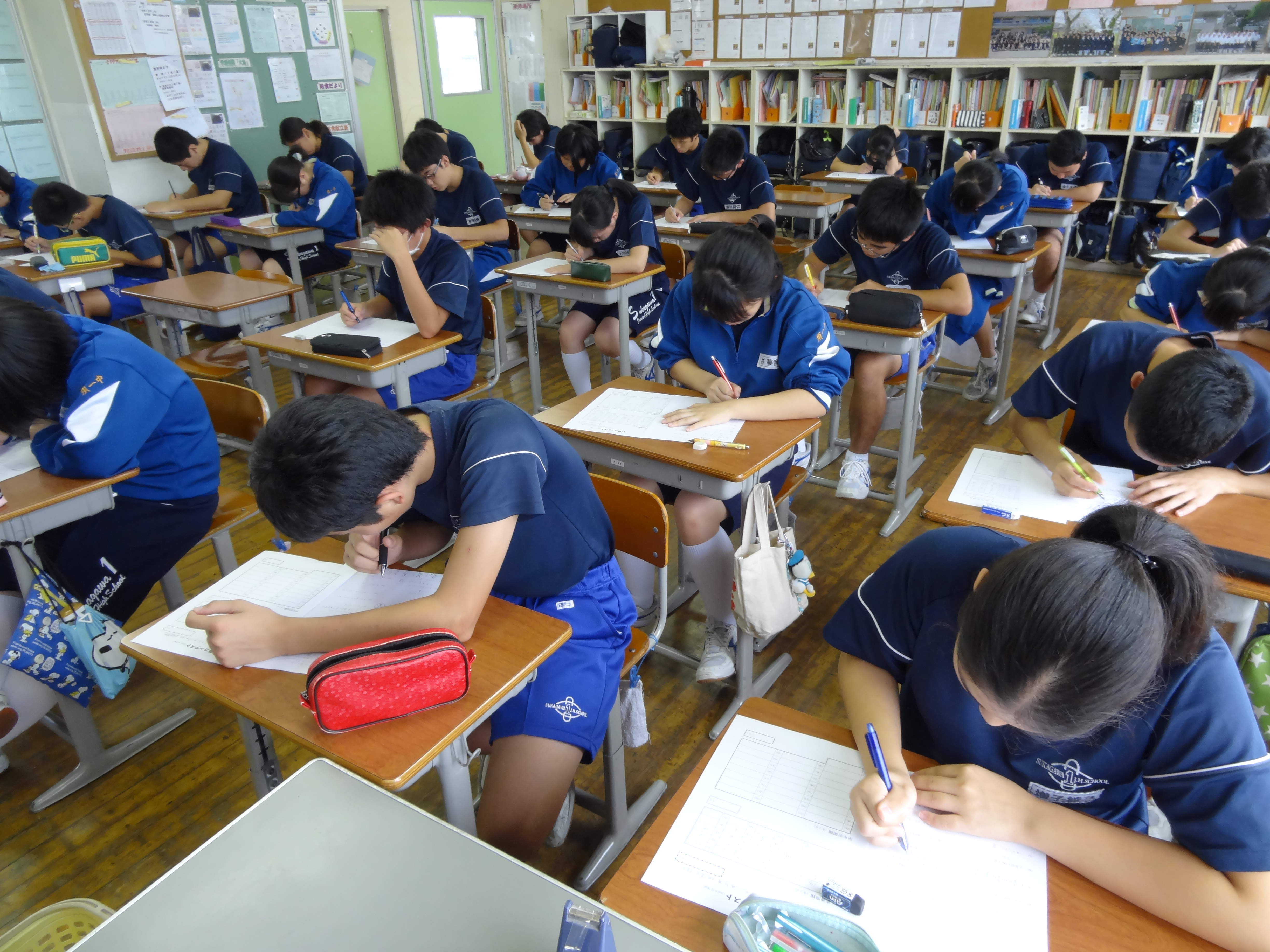 2018年9月10日 17時16分9月10日(月)6校時、計算コンテストを行いました。テスト範囲の問題は2学期が始まると配付されました。個人の得点ばかりでなく、学級の平均点を上げようと、生徒たちは家庭学習や朝学習の時間に何度も繰り返して練習してきました。その中から、全学年共通問題25問・学年問題25問・合計50問が出題されました。生徒たちは満点目指してテスト問題に真剣に取り組んでいました。手応えはどうだったでしょうか。どの問題も計算の基本となる大切な問題なので、理解不十分だった問題や不注意なミスをした問題はきちんと解けるよう必ず復習をしておきましょう。