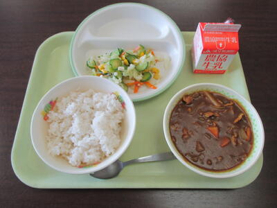 メニューは、麦ごはん、牛乳、ポークカレー、チーズサラダです。