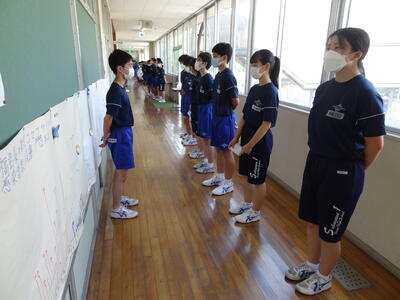 本日で1学期72日間の学校生活が終わりました。生徒たちは、コロナ禍そして本校体育館が使用できない状況下でも創意工夫しながら、授業はもとより部活動そしていろいろな行事を上手に乗り越え、約3ヶ月半で大きく成長しました。校長式辞の中では、生徒たちの1学期の生活についての賞賛の言葉とともに夏休みの過ごし方への呼びかけがありました。