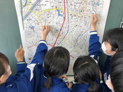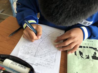 4月20日(火)4校時、各教室で交通安全教室を行いました。放送による担当教師の説明を聞いた後、各自に渡された「通学路危険個所確認票」の地図に自宅から学校までの通学路を赤線でなぞりました。そして、自分の通学路における危険個所を拾い出し、その内容を表に記入しました。最後は、黒板に掲示した拡大印刷した「通学路危険個所確認票」の地図に、学級全員が危険個所と感じる場所に赤丸のシールを貼りました。