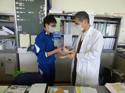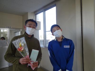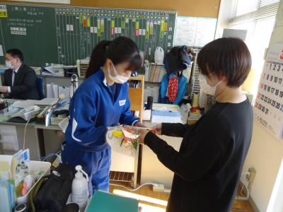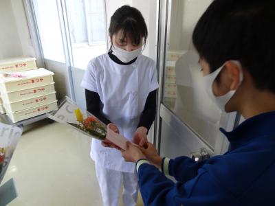 3月10日(水)昼休み、3年生が謝恩会を行いました。今年度は体育館での謝恩会は行わず、校長先生をはじめ諸先生方、用務員さん、調理員さんたちが昼休み活動している場所に代表生徒が直接行き、それぞれの先生方に感謝の手紙と花束を渡しました。先生方から励ましの言葉をもらったり握手をしてもらったりして、生徒たちと先生方との絆はさらに深まったようでした。