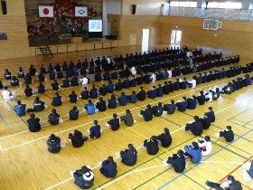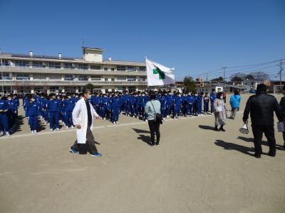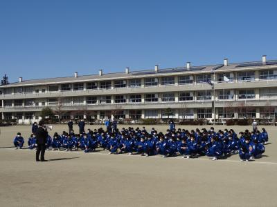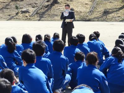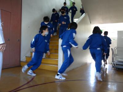 3月19日(金)昼休み、生徒たちに事前予告なしの避難訓練を行いました。今回の訓練は、昼休み中、大地震が発生し、危険があるため放送の指示に従って各自が安全を確保しながら速やかに校庭に避難するとの想定で行いました。昼休みということで、教室には先生がいなかったり生徒たちはいろいろな場所で活動したりしていました。そんな状況下でしたが、生徒たちは、冷静に緊急放送を聞き、各自が自らの命を守るために最善の方法をとって校庭にスムーズに避難することができました。