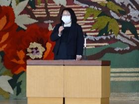 次に、10年前に本校で勤務をしていた先生からは、当時の本校の被害状況と共に、一小の高学年を受け入れた学校の様子や困難を乗り越えてきた先輩の話をしていただきました。現在のコロナ禍や先の地震での困難を、10年前の先輩方と同じように、みんなで協力し合って乗り越えてほしいと力強いメッセージをいただきました。