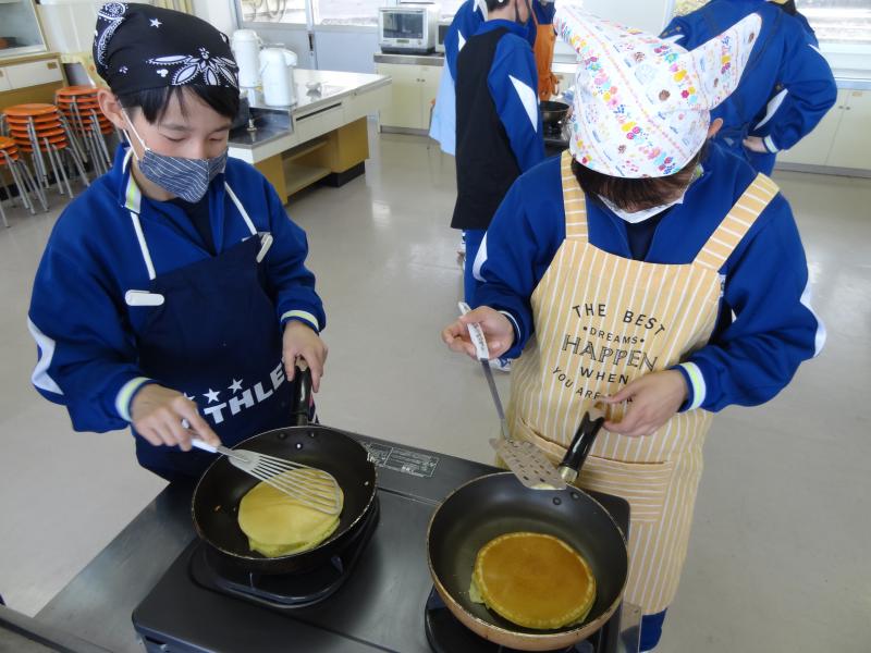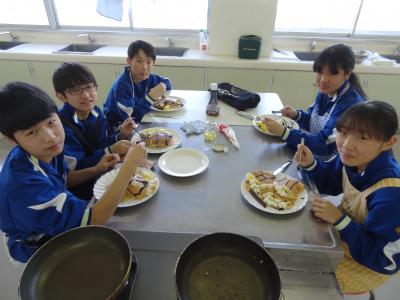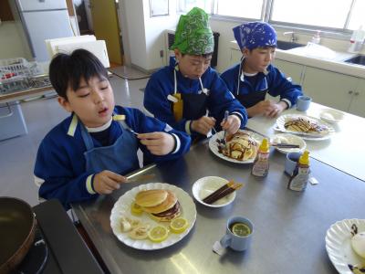3月15日(月)1・2校時、1年1組の生徒が調理実習「軽食づくり」を行いました。これまで2回調理実習を行ってきているので、今までよりも段取りよく能率的にできるだろうと安心していた生徒たちでしたが、ホットケーキの焼き加減が思ったよりも難しくかなり苦労していました。しかし、何回か焼いているうちにコツをつかんで上手に焼けるようになりました。各班で準備した食材を盛り付けるなどしてオリジナルのホットケーキを完成させました。そして、ナイフとフォークを手にしてテーブルマナーを意識しながら楽しく会食しました。