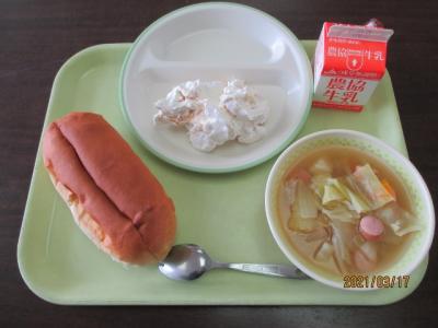メニューは、背割れコッペパン、フルーツクリーム和え、牛乳、ジャガイモとソーセージのスープです。
