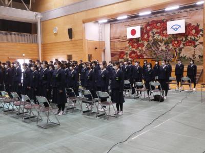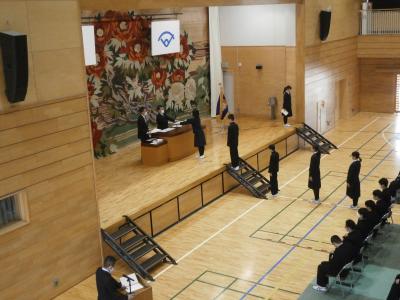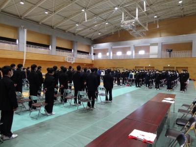 3月8日(月)5・6校時、3年生が中央体育館で卒業式の練習を行いました。過日の福島県沖地震により本校の体育館が使用できなくなり、これまで3学年の卒業式練習計画も止まったままでした。生徒たちにとっては久しぶりの練習再開となりましたが、それまで練習してきて理解していたことがうまく生かされ、卒業証書授与や式歌の練習もスムーズに進みました。