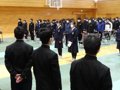なお、卒業式は中央体育館の収容人数の関係で、在校生は出席できません。本日、在校生は保護者席に座り、3年生の練習の様子を見学し、卒業式の雰囲気を感じ取りました。そして、卒業式予行終了後、在校生は3年生と対面し、先輩方と過ごした日々を思い出しながら感謝の言葉を3年生に伝えました。