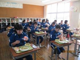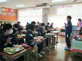3年生の各クラスをのぞいてみると、残すところ今回の給食を含めて2回しか食べることができない給食を、みんなで楽しくそして美味しそうに笑顔で食べていました。