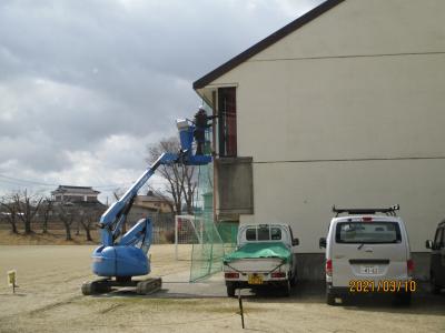 2月13日(土)の福島県沖地震で大きな被害があった本校体育館ですが、本日復旧工事に向けた前段階の工事が始まりました。