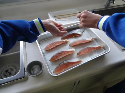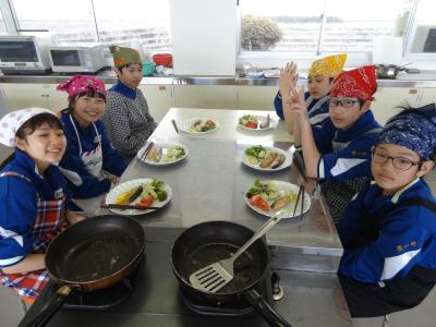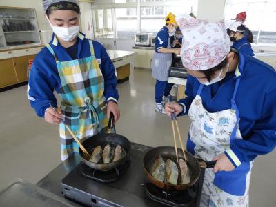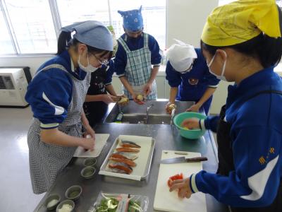 3月10日(水)1・2校時、1年3組の生徒が調理実習を行い、「鮭のムニエル」と「粉ふきいも」作りに挑戦しました。前回の調理実習の反省を生かし、「段取りよく・美味しく・衛生的に」を意識しながら、班員で協力して作業を進め、オリジナルメニューを完成させました。「魚料理も簡単にできるんだ」「粉ふきいもが難しかった」などの感想があり、生徒たちの食事作りへの関心度がさらに高まりました。生徒たちは食事をしながら、来週行う調理実習「軽食づくりとテーブルマナー」に向けて、ホットケーキにのせるトッピングを何にするかで話が盛り上がっていました。