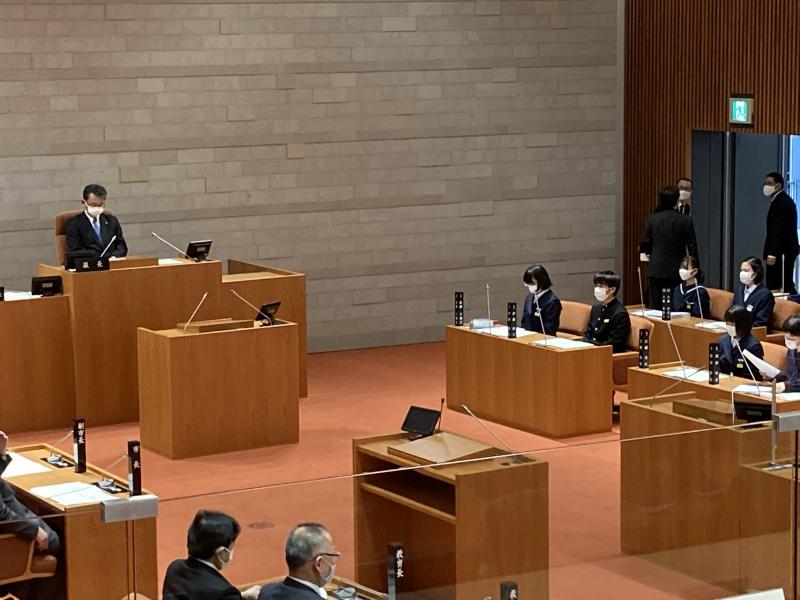 「議場に入ってその雰囲気に圧倒されたがしっかりと質問できた」「緊張したが、各学校の質問や答弁を聞いて勉強になった」「議会での話合いの上に自分たちの生活が成り立っていることが分かった」という感想が聞かれました。