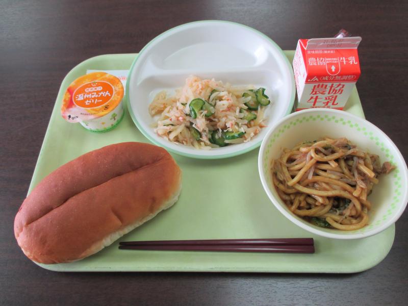 メニューは、背割れコッペパン、浪江焼きそば、大根サラダ、牛乳、みかんゼリーです。