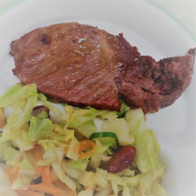 給食時、皿に盛り付けられた大きなビーフステーキを目にして、誰もが驚きました。これまでの給食でビーフステーキが登場した記憶はありません。食べてみると、焼きたてで温かくソースとも相まってとても美味しかったです。調理員さんたちが、心を込めて時間をかけて1枚1枚オーブンで焼いてくださったそうです。また、野菜サラダやみそ汁も地元で収穫された食材をふんだんに使ったもので歯ごたえも味も最高でした。肉と野菜のバランスもとてもよく、栄養満点の給食でした。