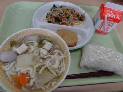 本日の給食献立は、けんちんうどん・牛乳・味付き餅入りいなり・三色おひたしでした。生徒たちは、久しぶりに登場したソフト麺の食感を楽しんでいました。また、味付き餅入りいなりは初登場でしたが、そのまま食べてもうどんにのせて食べてもとても美味しかったです。