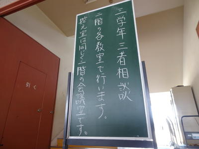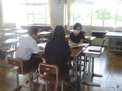 夏休みと同時に梅雨も明け、暑い夏がやってきました。そんな中、8月3日(月)~7日(金)の5日間、3学年では三者教育相談を行っています。生徒・保護者・担任が顔を合わせ進路を中心に熱心な話し合いを行っています。三者教育相談が終わると、その足で塾の夏期講習に直行する生徒も結構いるようで、3年生の頑張っている様子が伝わってきます。