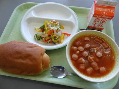 生徒たちが楽しみにしている給食も2学期初日から始まりました。本日の給食献立は、バターロールパン・牛乳・カラフルサラダ・豆とソーセージのトマトスープ煮・ミルメークでした。サラダもスープも彩りが鮮やかで、生徒たちの食欲をそそりました。栄養満点の給食をしっかり食べて、暑さを乗り切りましょう!