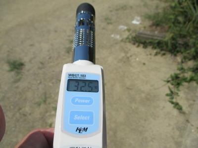 本校でも校庭の気温は35℃を超え、暑さ指数(WBGT)の写真のように32.5℃(危険)を示していました。