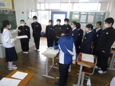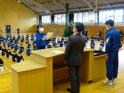 5月21日(木)4校時、避難訓練後、本年度最初の全校集会があり、前期学級委員の任命を行いました。学級委員長・副委員長が教室から学級を先導して静かに体育館に入場しました。その後、呼名に対して大きな声で返事をし、堂々とした態度で任命状を受け取りました。学級委員は、学級のまとめ役であるとともに学級と生徒会をつなぐパイプ役として責任ある行動をとってくれることを期待します。