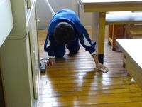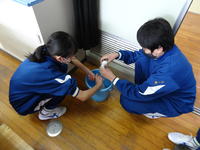 一中の清掃は、学級や学年の枠を超えて縦割り清掃を行っています。一班は各学年2~3名で構成され、清掃箇所のローテーションを年3回行っています。