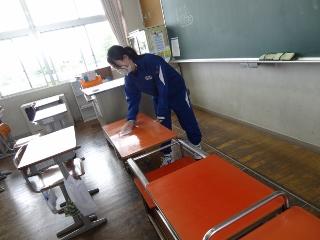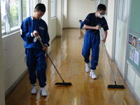 5月20日(水)4校時、放送による清掃ローテーション全体指導を行いました。生徒たちは、清掃担当教師から縦割り清掃の意義や清掃方法について詳しい説明を受けた後、指定された教室に移動し、班員の顔合わせと役割分担を確認しました。その後、清掃区域に移動して熱心に清掃を行いました。