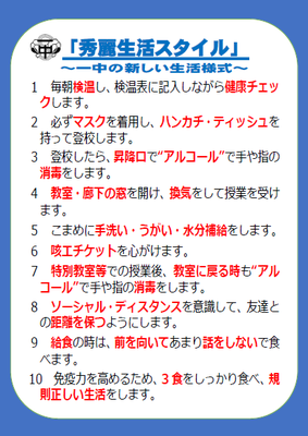 そこで、感染防止対策として、一中の「新しい生活様式」=「秀麗生活スタイル」を作成しました。