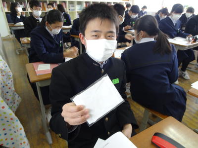 過日、文部科学省から学校に生徒用マスクが届きました。そして、本日4月22日(水)の生徒たちの登校に合わせ、各学級で生徒一人に1枚を配布しました。貴重なマスクですので、有効に使用しましょう。