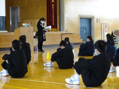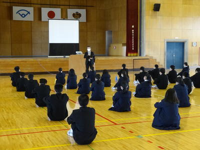 4月22日(水)朝、生徒たちが久しぶりに登校しました。コロナウイルス感染症対策による臨時休校が4月22日(水)~5月6日(水)まで延長となったため、短時間ですが、学年ごとに体育館で学年集会を行ったり各学級で学級活動をしたりして、今後の学習や生活について説明をするとともに生徒の健康観察を行いました。