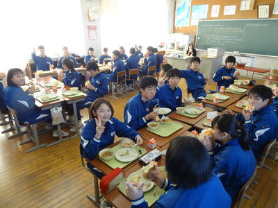 本日2月3日(月)は節分で、給食も節分献立でした。麦ごはん・牛乳・いわしのごまみそ煮・からしあえ・のっぺい汁・福豆が出ました。生徒たちは、健康に過ごせるように、災いを追い払えるように、そして第一志望校に合格できるように祈りながら給食を味わっていました。