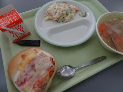 2月7日(金)、本日の給食は3年4組の希望献立で、ピザパン・牛乳・水ぎょうざ・ポテトサラダ・ミルメーク(コーヒー味)が出ました。普段の生活班の席を変えて、大勢で向かい合いながら食事をし会話も弾みました。