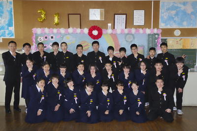 担任の呼名を受け、卒業生は大きな返事をして立ち上がり、堂々と登壇しました。そして、卒業生一人一人が長場壮夫校長から祝福の言葉をかけてもらいながらしっかりと卒業証書を受け取りました。卒業生は、証書を手に中学校3年間を振り返るとともに証書の重みを感じていました。最後は、校門前で在校生・保護者・先生の祝福を受けながら、男子30名 女子32名 計62名が笑顔で巣立っていきました。