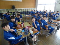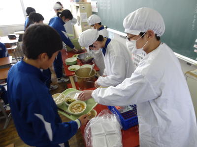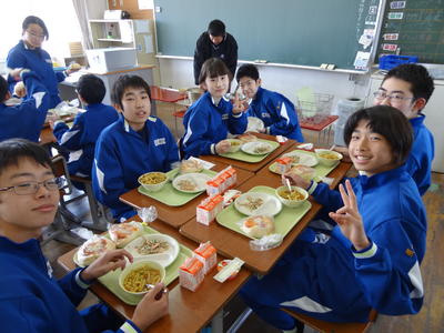 そして、3月20日(水)の給食献立は、チーズフォンデュパン・牛乳・マカロニのカレー煮・かみかみごぼうサラダ・アセロラゼリーでした。どの献立も生徒たちの好きなものばかりで、本年度最後の給食を満喫していました。
