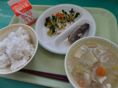 須賀川市では、毎月19日は「食育の日献立」として、給食に栄養バランスのよい和食を提供するようにしています。3月19日(火)の給食は、「食育献立:魚を食べよう」で、麦ごはん・牛乳・いわしのごま味噌煮・おかか和え・豚汁が出ました。