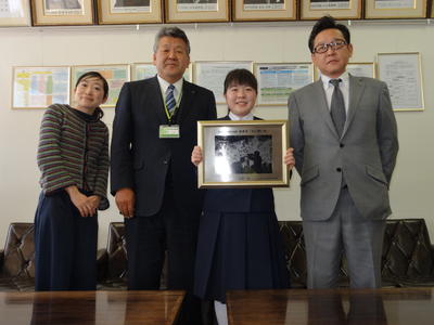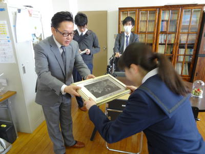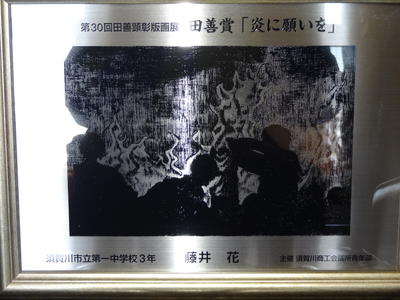 2月12日(火)のHPでも紹介しましたが、藤井花さん(3年生)の作品「炎に願いを」が「第30回田善顕彰版画展」において最高賞の「田善賞」に選ばれました。その栄誉をたたえて、3月20日(水)校長室において田善賞プレート贈呈式が行われました。須賀川市商工会議所青年部会長の村井達也様よりアルミ製のレプリカプレートが本人に伝達されました。また、新聞社からの取材を受け、藤井花さんは「一中生の松明あかしに向けた熱い思いを表現しました。」と力強く答えてくれました。