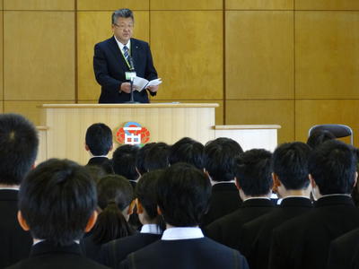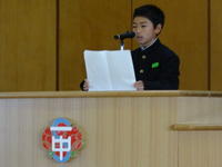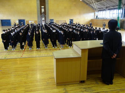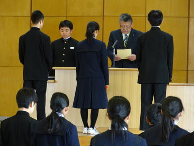 3月22日(金)1校時、修了式に先立って精励賞授与式を行い、1年生31名、2年生49名が1年間無欠席で表彰されました。引き続き修了式を行い、校長から、生徒たちの1年間の頑張りを称賛する言葉かけや4月からの新たな活躍を期待する言葉かけがありました。その後、1・2年生代表及び生徒会代表者が堂々と1年間の反省と次年度への抱負を述べました。