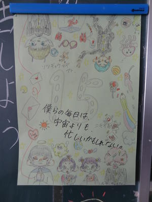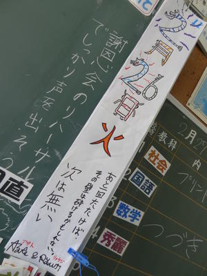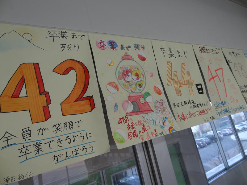 3年生の各教室には、黒板の片隅や壁に卒業式までのカウントダウンカレンダーが掲示されています。生徒一人一人の手作りカレンダーには、1ヶ月半以上も前からその日の生活目標や励ましのメッセージが書かれています。本日2月26日(火)で、卒業までの登校日は残り11日となりました。生徒たちは、カレンダーを目にしながら、これまでの中学校生活を思い起こしたり、級友の言葉に勇気づけられたりして一日一日を大切に過ごしています。