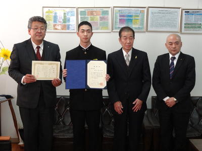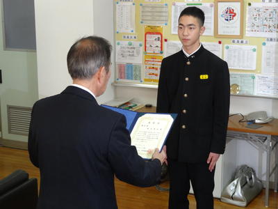 2月7日(木)16:00から、校長室で「第68回社会を明るくする運動」作文コンテストの表彰式を行いました。日常の家庭生活や学校生活の中で体験したことを基に、言葉の大切さや思いやりの気持ちを持つ必要性を綴った根本晴生君(3年生)の作文「今を見て未来を創る」が見事『福島県推進委員会優秀賞(福島県推進委員長 内堀雅雄福島県知事)』を受賞しました。また、須賀川地区保護司会の優秀賞にも輝き、須賀川地区保護司会会長の大野修司様より表彰状の伝達を受けました。新聞4社からの取材を受け少し緊張した様子の根本君でしたが、新聞記者からのインタビューに対して「僕は笑顔あふれる幸せな未来を臨んでいます!」と力強く答えていました。