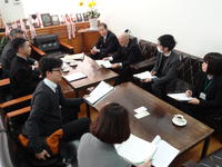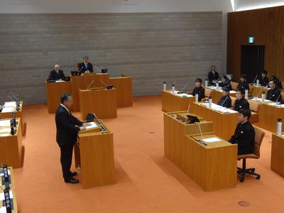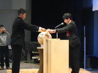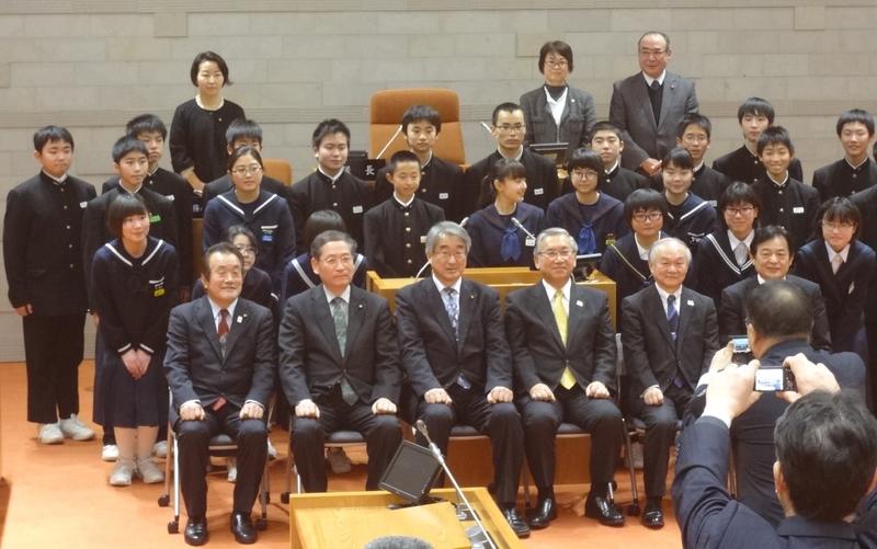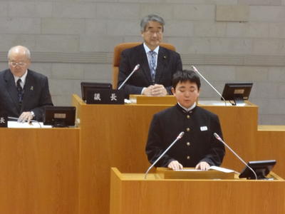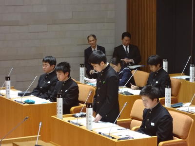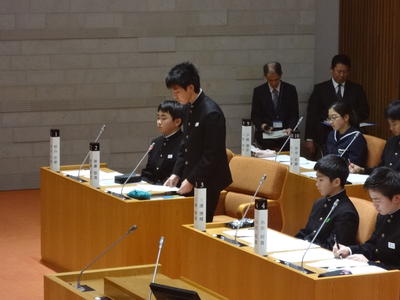 1月30日(水)午後、生徒会会長の杉山匠磨君(2年)、生徒会会計の後藤悠哉君(2年)、生徒会副会長の三浦博翔君(1年)3名が須賀川市役所市議会議場で行われた「須賀川市中学生による模擬会議」に参加しました。市内の各中学校から選出された24名が、一般質問をする議員などに扮して質問し、それに市長や教育長が答弁するという本番さながらの白熱したやり取りが行われました。本校からは、杉山匠磨議員が、「空き家の現状と市としての対策等についての市長の考えについて」を質問しました。