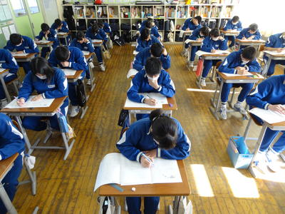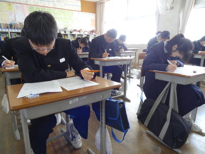 一方、3年生は本年度最後の実力テストを行いました。約1ヶ月後に迫った県立高校Ⅱ期選抜試験当日を想定して、テスト時間中はもちろん、休み時間の過ごし方などにも気を配りながら一日を過ごしました。