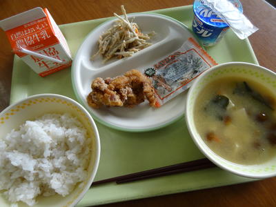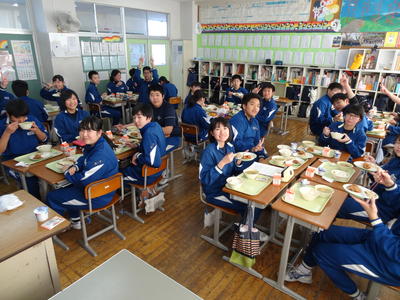 1月28日(月)、本日の給食は3年2組の希望献立で、麦ごはん・から揚げ・しそひじき・牛乳・かみかみごぼうサラダ・なめこ汁・ヨーグルトが出ました。3年2組の生徒たちは、大好きなメニューを口にしながらいつもより友人との会話も弾んでいました。