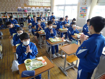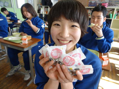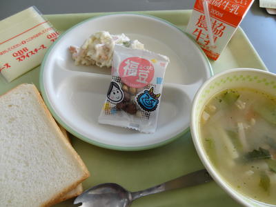 本日2月1日(金)の給食は、2月3日が休日のため一足早い「節分献立」で、食パン・ミネストローネスープ・牛乳・ポテトサラダ・スライスチーズ・福豆が出ました。2月も各種行事が盛り沢山です。生徒たちは、厄を追い払うとともに健康で学校生活が送れますようにと願いながら給食を食べていました。